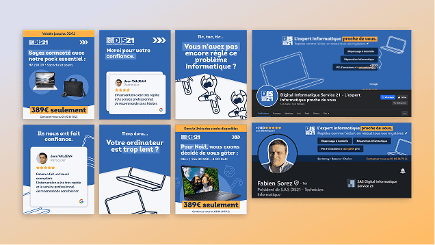Développement d'identité visuelle, templates réseaux sociaux et travail de communication pour une entreprise de réparation informatique.